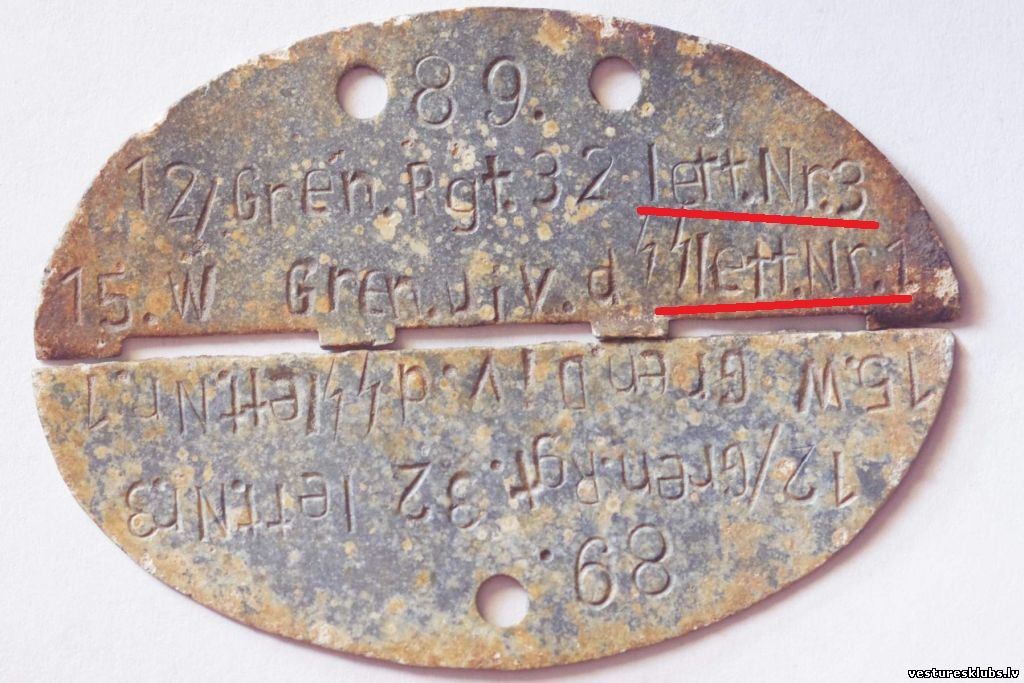 Ar Lett.Nr.1. ir apzīmēta 15. divīzija. Tālāk rakstīts 2/GREN. AUFKL. BTL. 15 - 15. grenadieru izlūkbataljona 2. rota. Kā redzams, tad žetons ir bijis ar jau rūpnīcā iestrādātu marķējumu Waffen SS, iespējams, tāpēc trūkusi vieta, kur iesist tradicionālo Lett.SS.Frw.Div.